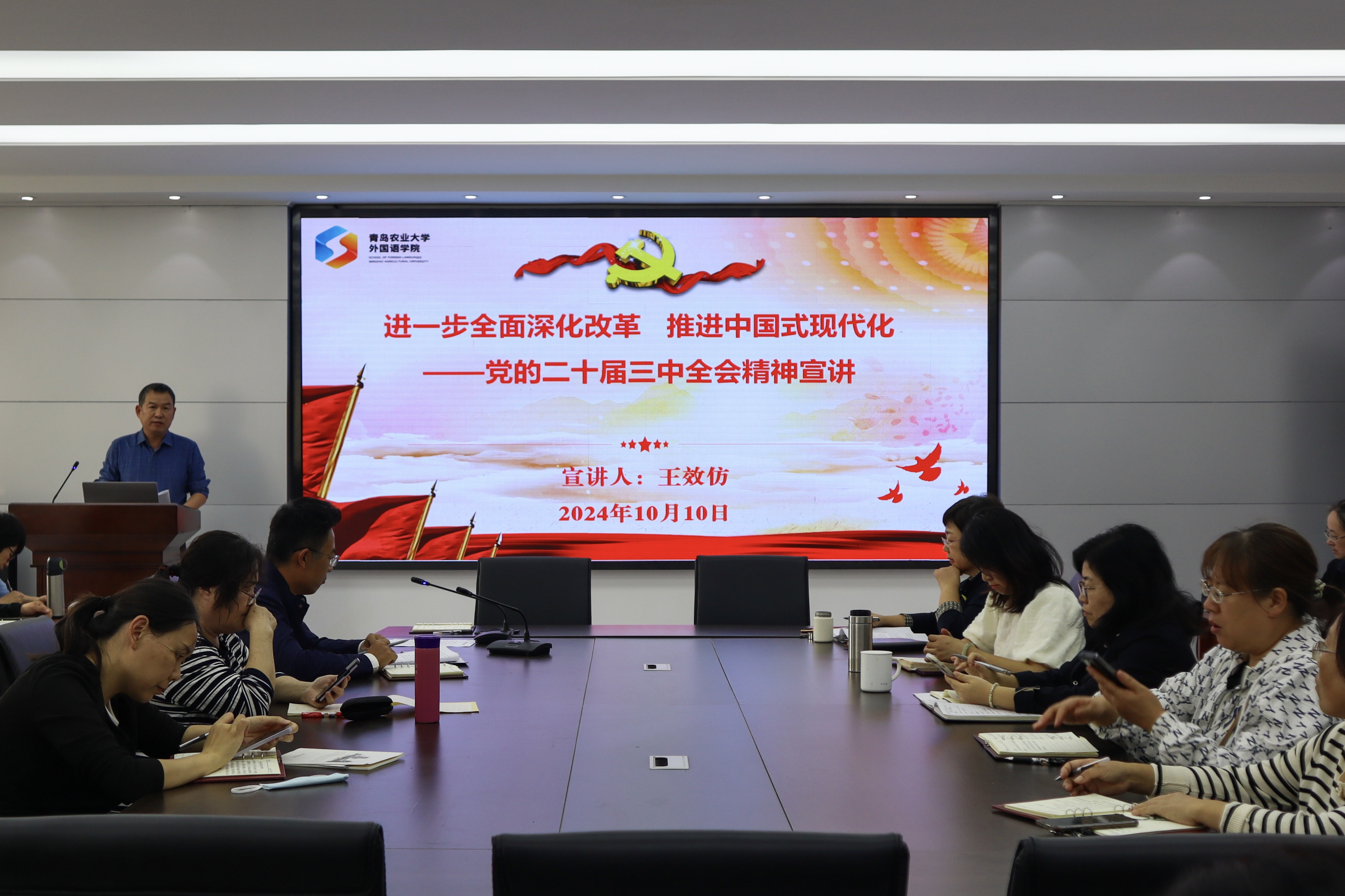 会上,首先由王效仿根据学校要求,从党的二十届三中全会基本情况和重大意义、深入学习领会习近平总书记在党的二十届三中全会上的重要讲话精神、全面准确理解《决定》提出的进一步全面深化改革重大举措、全力以赴抓好全会精神贯彻落实、配合学校扎实推进综合改革等五个方面进行了党的二十届三中全会精神宣讲。之后,学院党委副书记副院长盛金玉传达全国教育大会精神,带领全体教职工学习《习近平在全国教育大会上强调 紧紧围绕立德树人根本任务 朝着建成教育强国战略目标扎实迈进》《中共中央 国务院关于弘扬教育家精神加强新时代高素质专业化教师队伍建设的意见》。