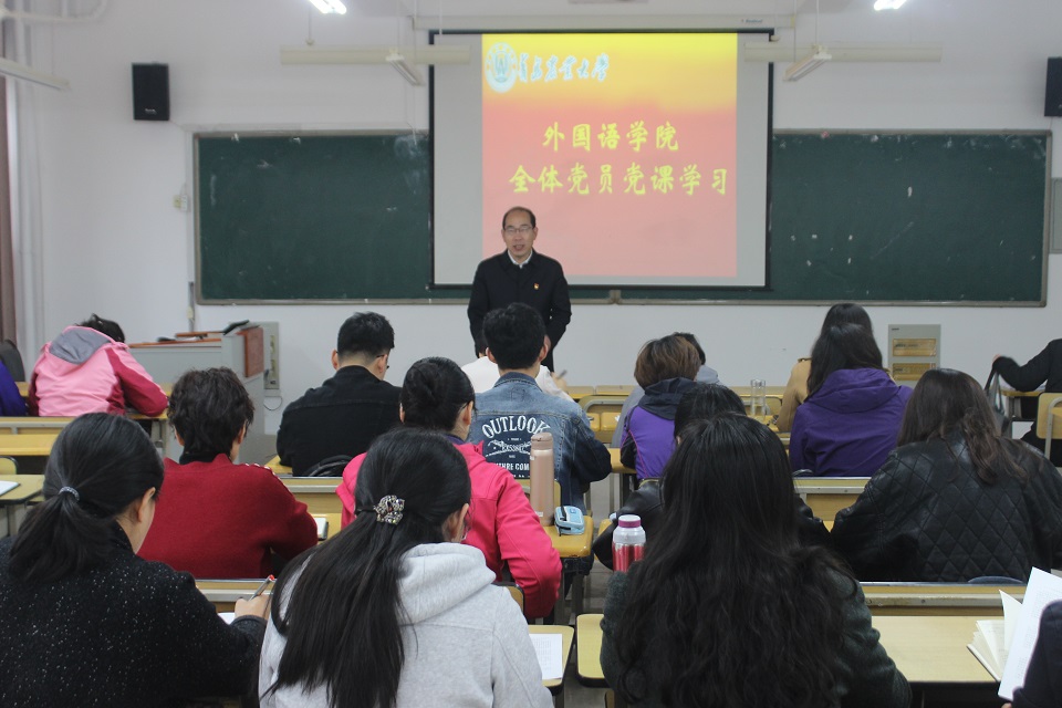 4月28日,英国正版365官方网站在文经楼C214教室举行学习《中共中央关于加强党的政治建设的意见》(以下简称《意见》)专题党课,党课由学院党委书记王仁高主讲,全体师生党员参加学习。